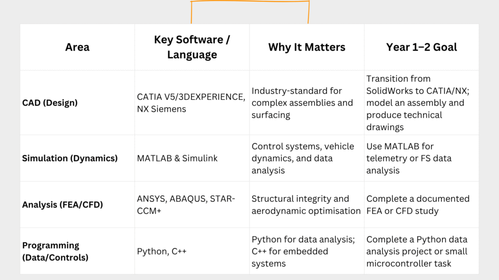 F1 teams rely on advanced software for design, simulation, and data analysis. Demonstrating competence signals that you can integrate quickly into a technical department.