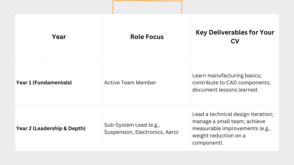 Joining and actively contributing to your university’s Formula Student (or Formula SAE) team is highly recommended. It simulates the multidisciplinary, high-pressure environment of a Formula 1 team and is strongly valued by recruiters.